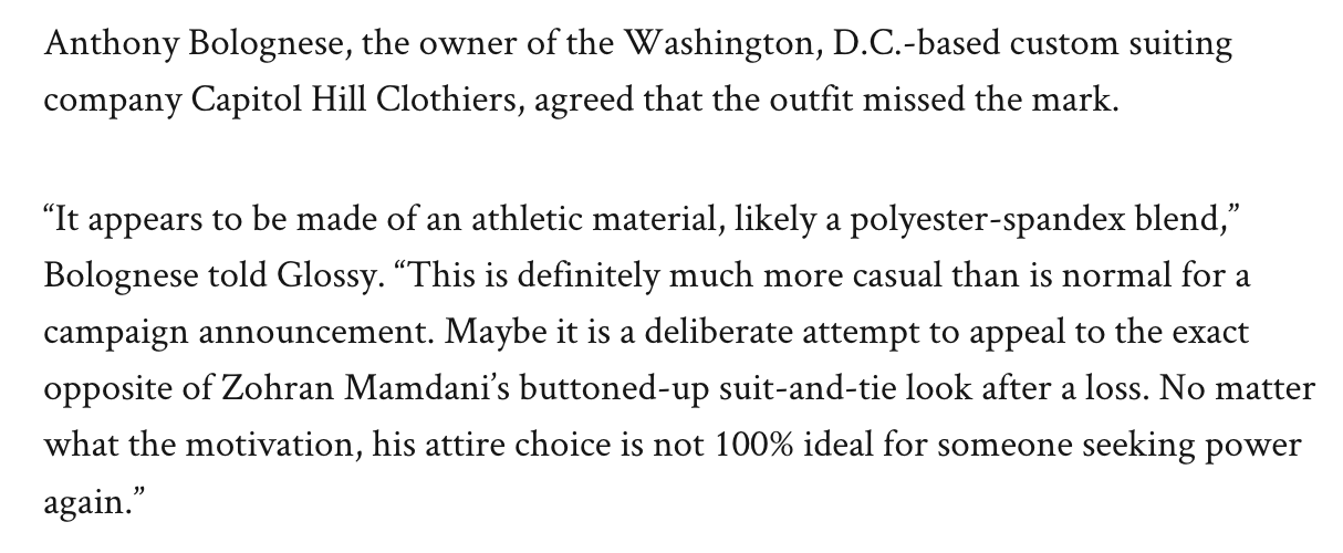 Custom clothier in Washington, DC Anthony Bolognese was asked for his opinions on Andrew Cuomo’s clothing choices for his July 2025 campaign for a Glossy.com article.